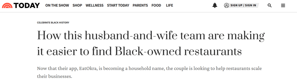 The couple met on Tinder and will celebrate three years of marriage in August. While dating, their love language became trying new restaurants together. Now they’re sharing that love on EatOkra, an app the pair launched in 2020 to connect people to more than 11,000 Black-owned restaurants across the country.