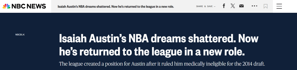 Austin’s mother delivered the news that he was medically ineligible to play in the NBA. Austin, who is blind in his right eye, said he knew before then that there was a chance he could not play, but he brushed it off. He was also notified at the NBA combine, where top draft prospects are exhaustively examined and assessed, that his DNA would be tested for Marfan syndrome. Still, he said, he thought he was in the clear because he was allowed to go through the pre-draft process.