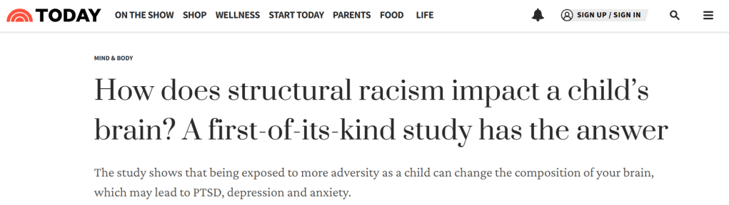 The new study found that Black kids were more likely than white kids to experience “toxic stress,” which it defined as “prolonged exposure to adverse experiences that leads to excessive activation of stress response systems and an accumulation of stress hormones.” Toxic stress can contribute to changes in the volume, size and shape of certain regions of the brain that are linked to PTSD, depression and anxiety, according to the study.