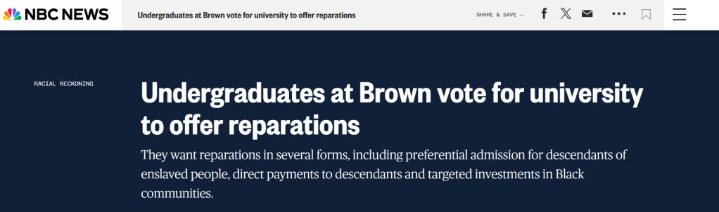 Undergraduate students at the Ivy League school in Providence, Rhode Island, voted on two referendum questions last week during its annual election. One asked whether Brown should make “all possible efforts to identify the descendants of enslaved Africans who were entangled with and/or afflicted by the University and Brown family and their associates.” The other asked whether Brown should provide reparations to those descendants of slaves. The questions were approved with about 89 percent and 85 percent, respectively.